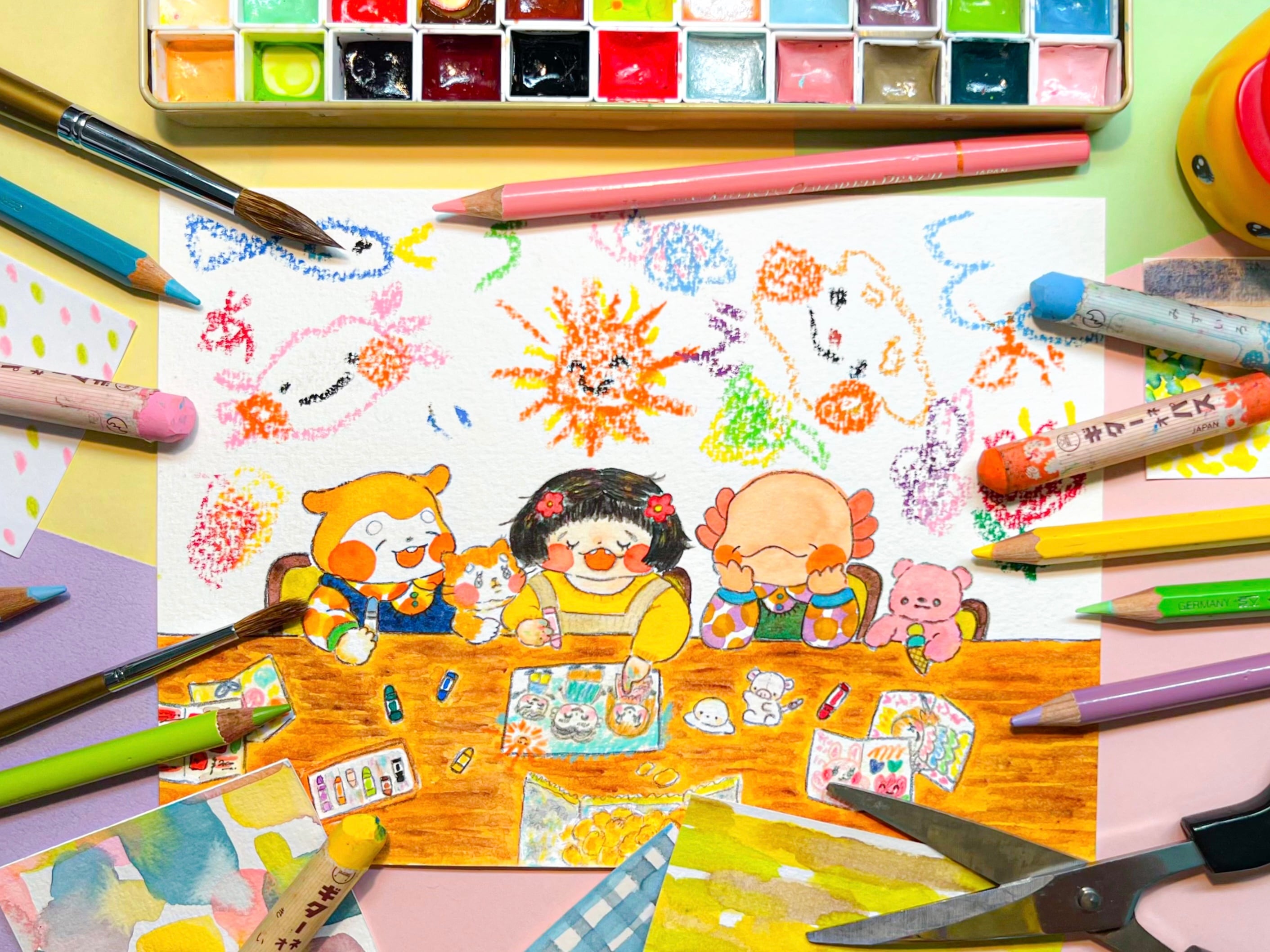 「みんなでぬくぬく」 サイズ : タテ 16cm × ヨコ 22cm (フレーム込み) 使用画材 : 水彩絵の具、色鉛筆 -------------- 必ずお読みください --------------- 【作品について】 ⚫︎アナログ作品ですので画像と実際の原画とで若干の色味の違いが生じます。 ⚫︎著作権はみやしたりのが所有いたします。 SNS等での画像掲載やグッズ等(複製)に使用する場合がございます。 ⚫︎お客様のご都合による返品・交換は基本致しかねます。 以上の点をご了承頂ける方のみご購入をお願い致します。